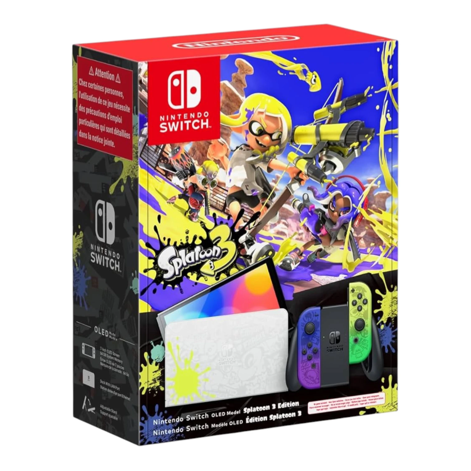 🦑✨ La Consola Nintendo Switch OLED Splatoon 3 es una de las ediciones especiales más atrevidas y coloridas que Nintendo ha lanzado para su consola híbrida. Diseñada para celebrar Splatoon 3, el shooter de tinta más popular del mundo Nintendo, esta consola trae una explosión de colores neón 🌈 que la hace única entre todas las versiones del Switch OLED.